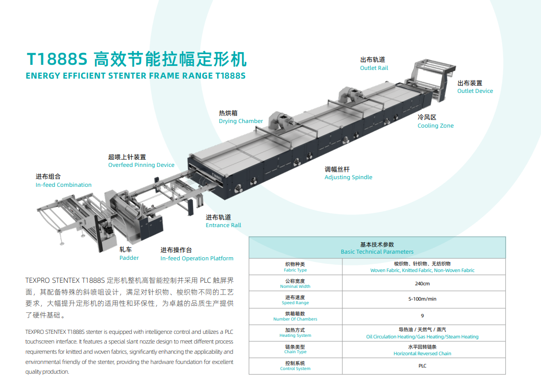 产品简介:TEXPRO STENTEX T1888S 定形机整机高智能控制并采用 PLC 触屏界 面,其配备特殊的斜喷咀设计,满足对针织物、梭织物不同的工艺 要求,大幅提升定形机的适用性和环保性,为卓越的品质生产提供 了硬件基础。